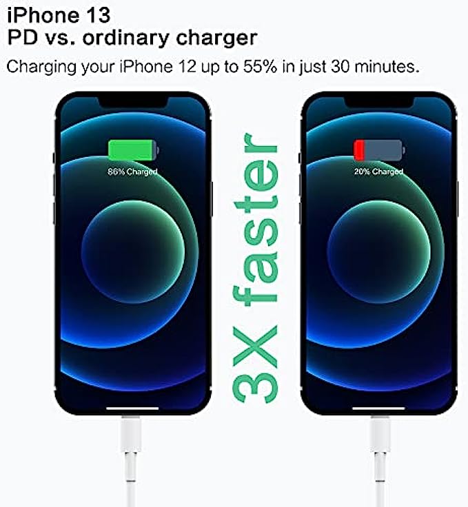 ★【3X iPhone Charger Fast Charging】 The 20W USB-C port PD fast adapter USB C wall charger and 6ft usb c to lightning cable, which can reach up to 3X faster than the Apple original 5W charger. It will charge your iPhone devices up to 57% power in just 30 minutes! Fully charge will take 1.8 hours only! ◆【Safety Protection】 With The Intelligent Chip Inside, 20W USB C Charger Offers Multiple Safeguards Automatically. ETL, FCC, CE, ROHS Certificated. Multi-Charging Protection will perfectly protect both your iphone/ipad devices also the brick/ cord against overheating, excessive current, short-circuit and overcharging. Apple MFi iPhone charging cable promises no warning message pops up. Exhaustive Protection While Charging. ★【PD 3.0 High-Speed iPhone Charger】Fast charge for most USB-C iphone 13 or tablet including iPhone 13/13 Mini/13 Pro/12/12Pro/12 Pro Max/12 Mini/11/11 Pro/11 Pro Max/XS Max/XS/X/XR/8 Plus/8, iPad Pro/ iPad Air/ iPad, AirPods Pro. Standrad Charging Speed works with iPhone 7/7 Plus/6s/6s Plus/6/6 Plus/SE/5s/5/5c. ◆【Perfect combination with 4 Pack】2 Pack 20W USB-C iPhone charger and 2 Pack 6FT USB-C to Lightning cable which can satisfy the needs of multiple iphone devices in different places like iphone/ipad/ AirPods,and also for family or friends to use with. Portable and compact design makes it easier to put into your pocket/bag/backpack for traveling or in the car use. ☎【Our Convnient Support】We provide 1-Year worry-free replacement guarantee. If you have any concerns, please do not hesitate to contact us! We promise to solve your problems within 24 Hrs!