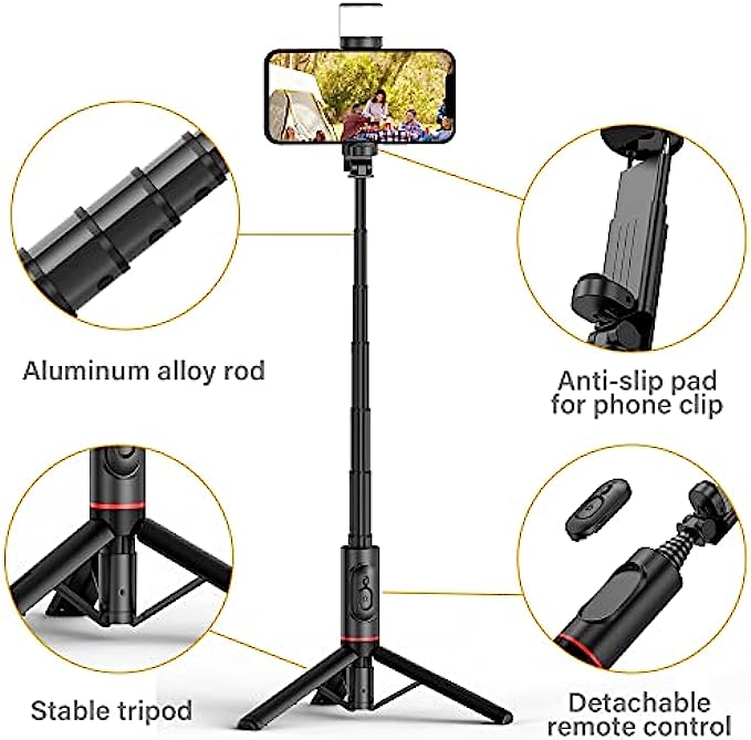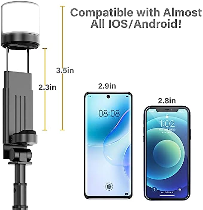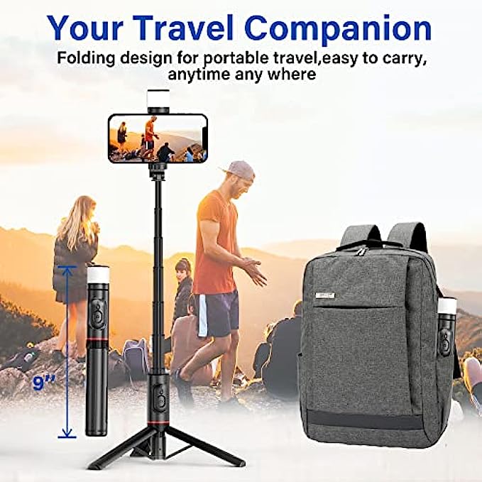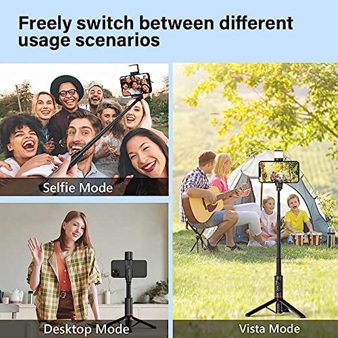 • ?【Rechargeable And Rotatable LED Fill Light】This 2022 new-upgraded selfie stick tripod is equipped with a 360°Rotation LED Fill Light. 3 color temperature modes(white, natural, and warm) and each mode has 3 brightness levels, offering 9 options to help you take clear pictures in subdued lighting, then stand out. Perfect for selfies, vlogs, live streaming, group photos, etc.