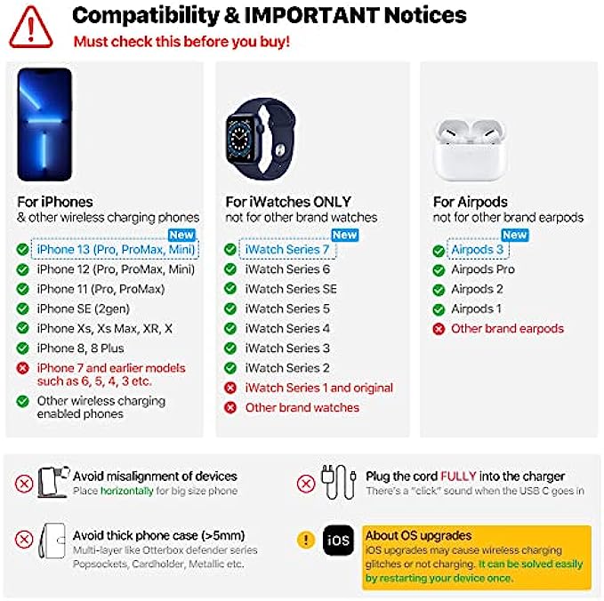 • 【Universal Compatibility】 Qi-standard works with iPhone 13/13 Pro/13 Pro Max/13 Mini/12/12 Pro/12 Pro Max/12 Mini/11/11 Pro/11 Pro Max/XS/XR/XS MAX/X/8/8Plus, iWatch series 7/6/SE/5/4/3/2 (series 1/original not supported) and AirPods Pro/3/2/1, and other 100+ popular wireless charging phones.