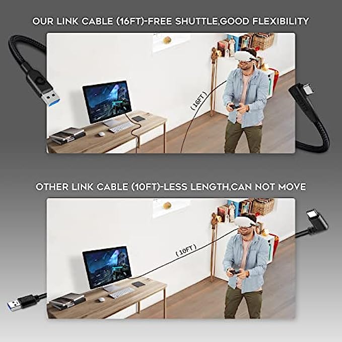 【16FT Extended Length and 90-Degree Right Angle Design】16ft link cable long enough in the room, allow you to move freely without restriction when playing games. Featuring a 90° right angle prevents disconnection and is more stable, giving you an immersive VR gaming experience.